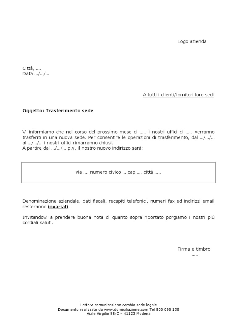 Scrivere una lettera di trasferimento aziendale [campioni gratuiti ... Esempio 1 - Lettera di trasferimento aziendale. Per soddisfare la nostra base di clienti in crescita, sposteremo la nostra sede aziendale a NUOVO INDIRIZZO. Il nostro ultimo giorno operativo presso la sede attuale è il DATE e saremo pronti ad accettare le vostre spedizioni presso la nostra nuova sede il DATE. Scrivere una lettera di richiesta di trasferimento di conto bancario ... Un bonifico bancario internazionale richiede una lettera di istruzioni. La lettera deve contenere il nome del cliente, l'indirizzo, il numero di conto, l'importo da trasferire e le informazioni del destinatario sopra menzionate. Tuttavia, prima di scrivere una lettera, il cliente dovrebbe sapere se la banca richiede moduli di bonifico bancario.