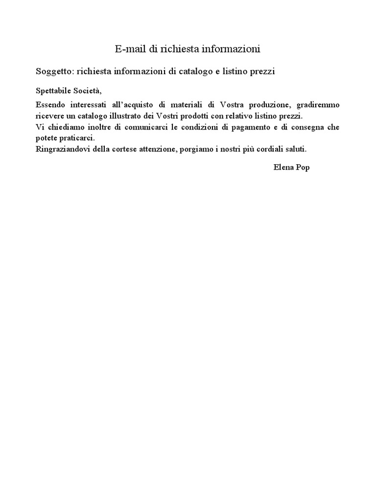 Fac simile richiesta invio catalogo (in inglese) Fac simile richiesta invio catalogo (in inglese) Dear Sir/Madam Please send me a copy of your catalogue and an up-to-date price list of calculators together with copies of any any publicity material that I could pass to prospective customers. Yours faithfully. Gentile Signore/a La prego d ...