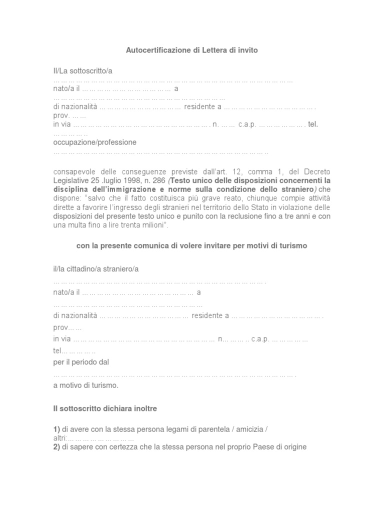 PDF Ambasciata d'Italia in ….. ….. Consolato Generale d ... - Esteri Lettera di invito per AFFARI (Facsimile) ... Il/La Sottoscritto/a nel formulare il presente invito, dichiara di essere a conoscenza delle vigenti leggi in materia di immigrazione e delle responsabilità derivanti dall'articolo 12 del D.Lgs. n. 286/98 e s.m.i. ... (Il presente modulo va compilato in tutti i suoi campi dalla società invitante ...