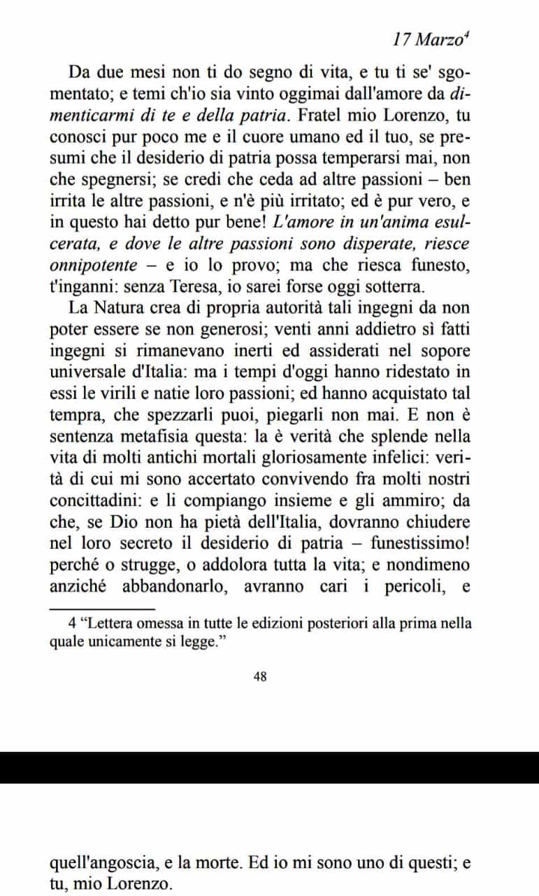 Lettera del 17 marzo 1798, Le ultime lettere di Jacopo Ortis (66262 punti) 9' di lettura Lettera del 17 marzo 1798, Le ultime lettere di Jacopo Ortis "17 Marzo Da due mesi non ti do segno di vita, e tu ti se' sgomentato; e temi ch'io sia vinto...